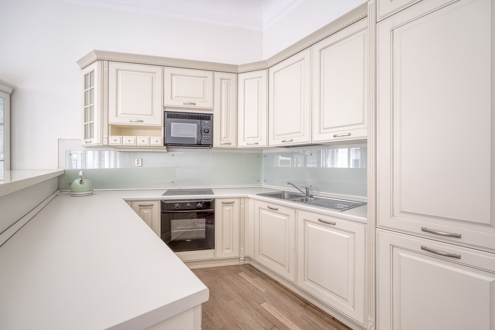 Na podlaze parkety, kuchyň komplet vybavena, v koupelně vana.